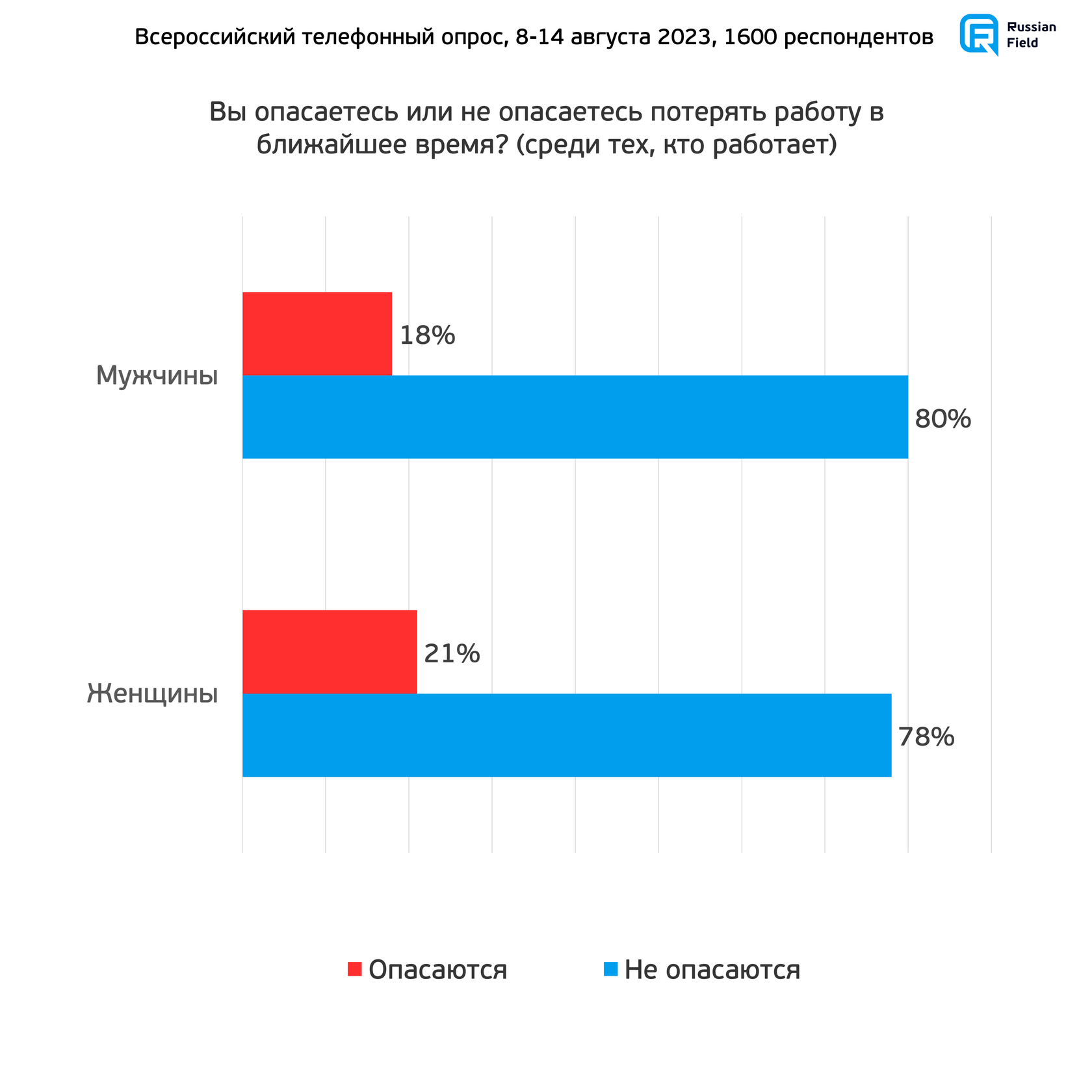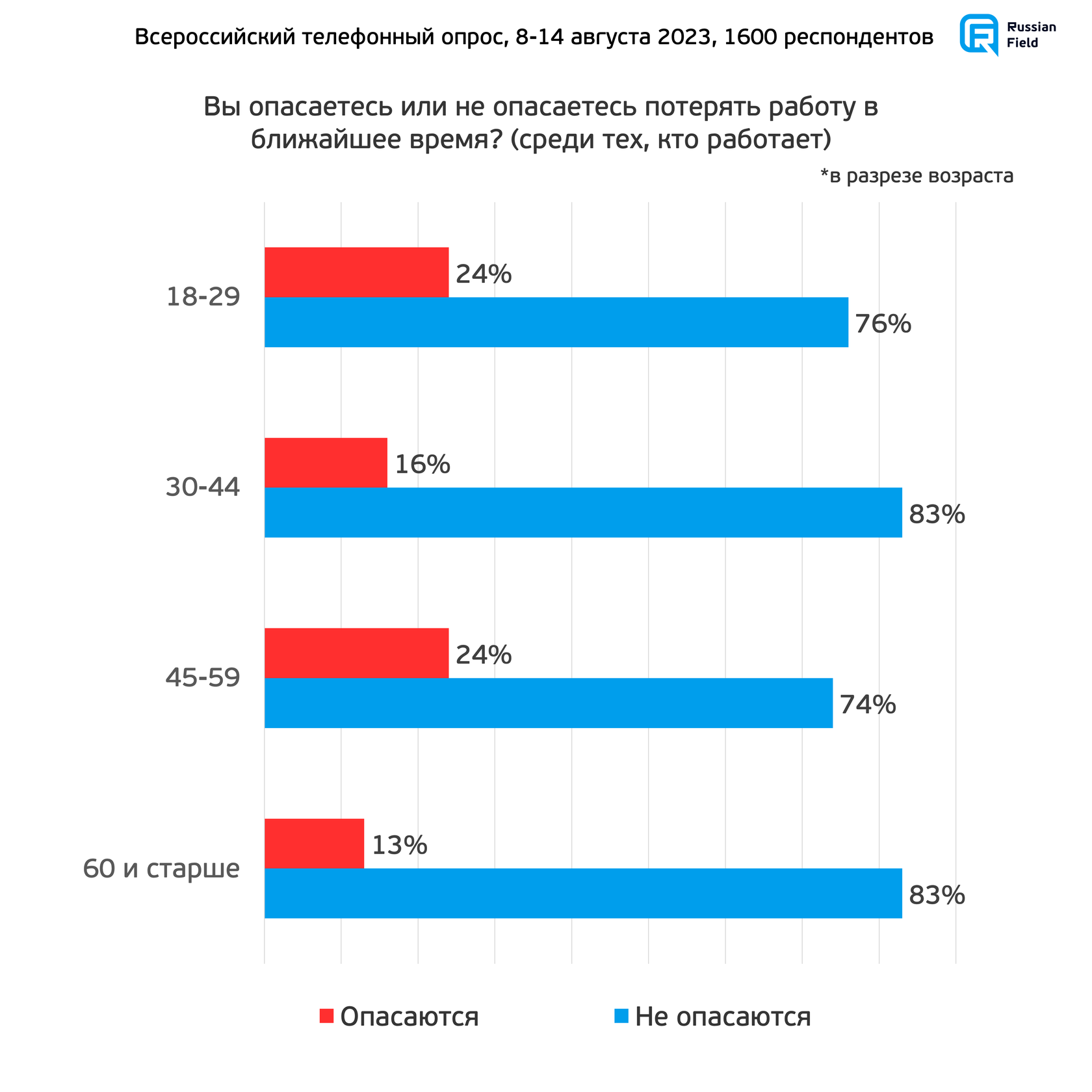 Среди работающих опрошенных 20% опасаются потерять работу. Этот страх в основном характерен для молодежи и респондентов 45-59 лет. Также доля опасающихся снижается вместе с ростом доходов.