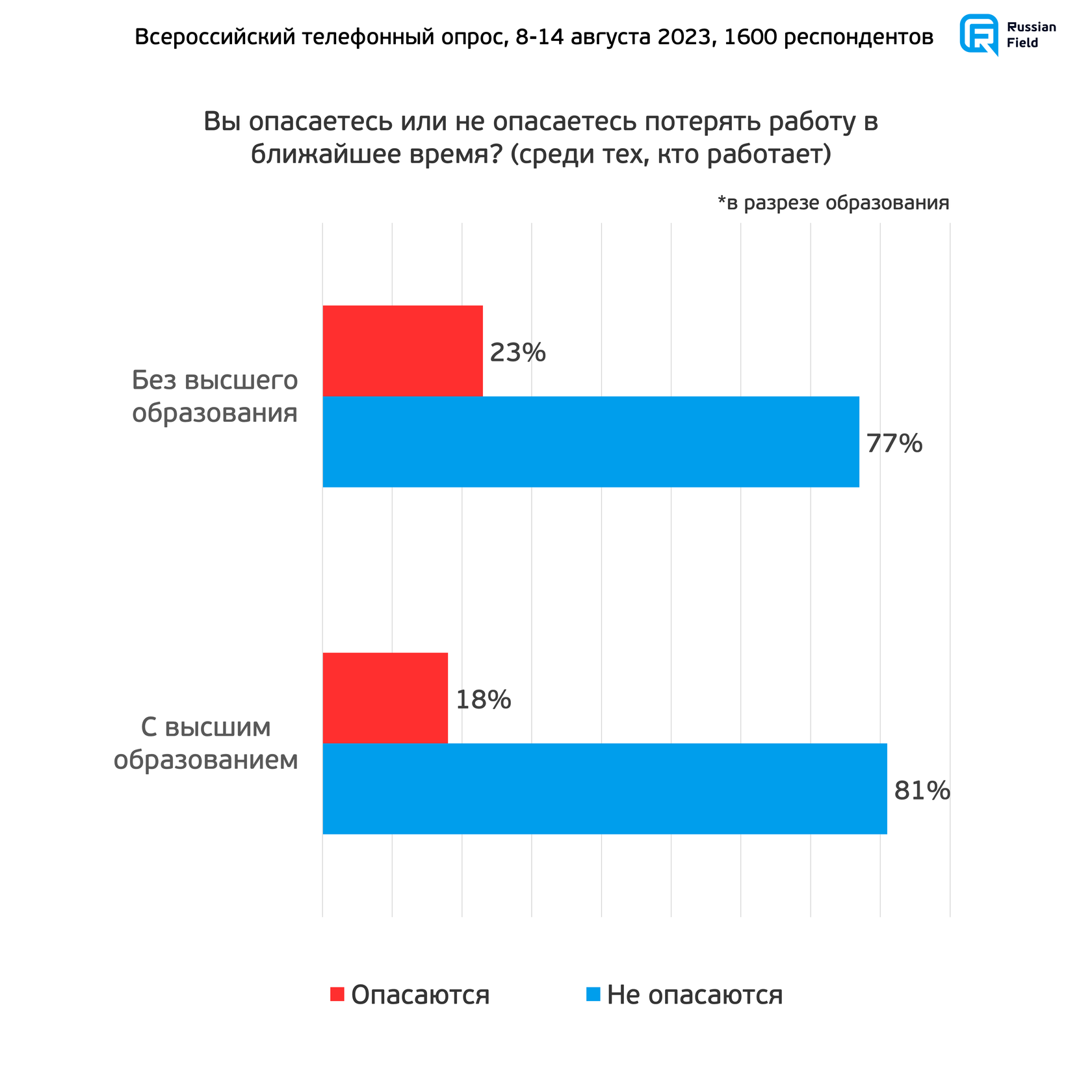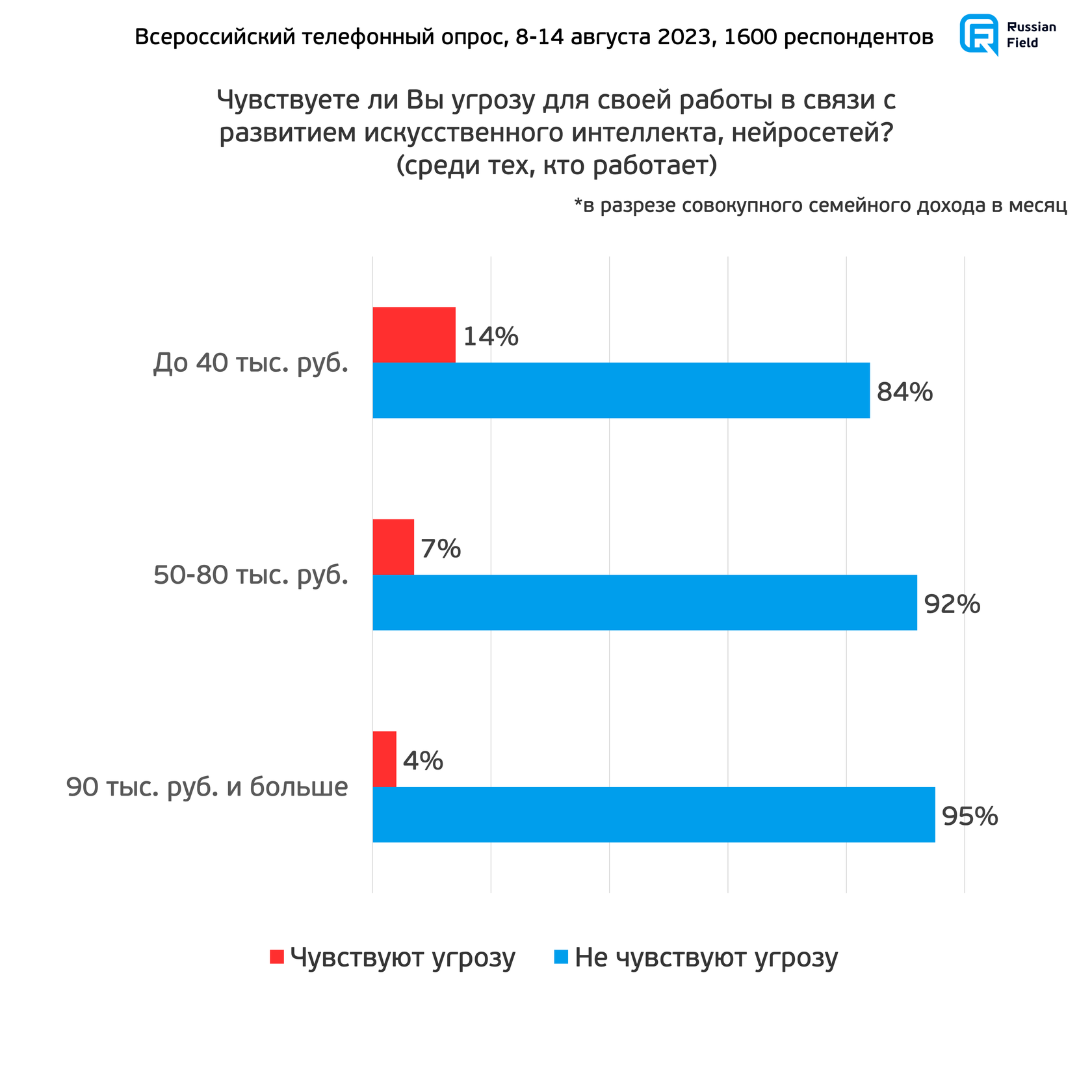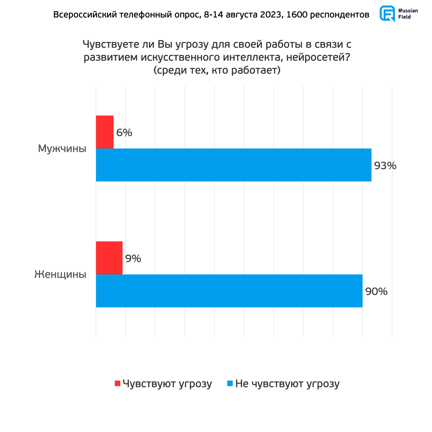 Кроме того, опасения потери работы характерны почти для трети (33%) тех, кто чувствуют угрозу для своей работы в связи с развитием искусственного интеллекта.