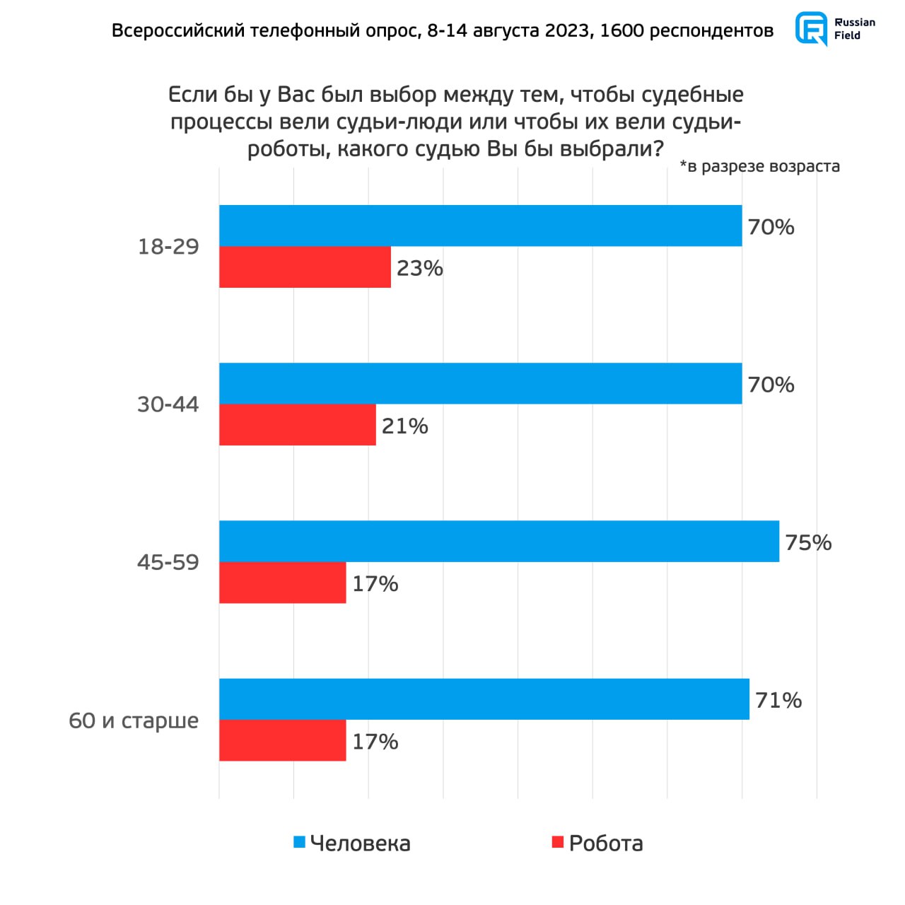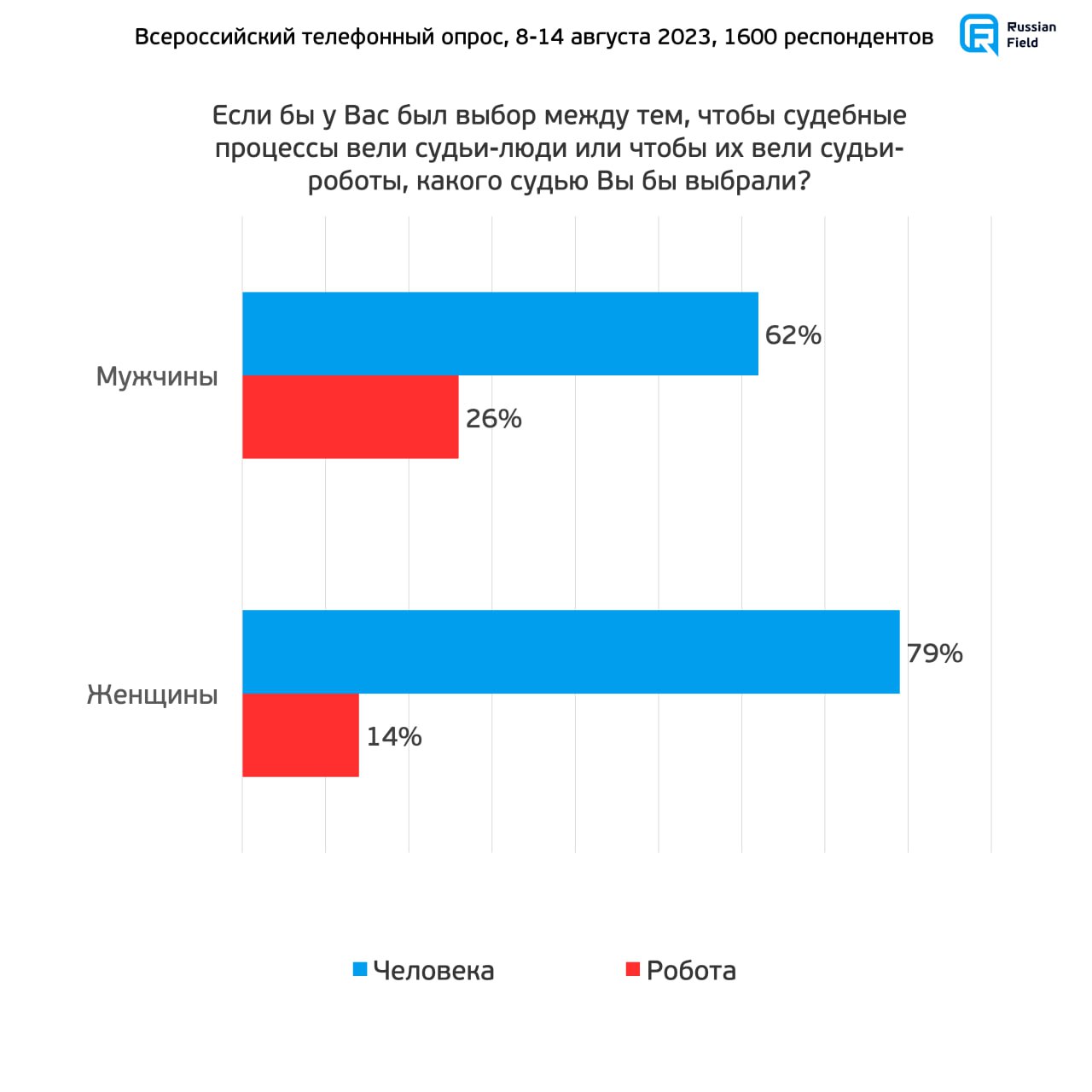 Подавляющее большинство респондентов предпочли бы оставить проведение судебных процессов за судьями-людьми (71%). Лишь 19% готовы были бы доверить их роботам. Судей роботов несколько чаще выбирают мужчины (26%) и молодежь 18-29 лет (23%).