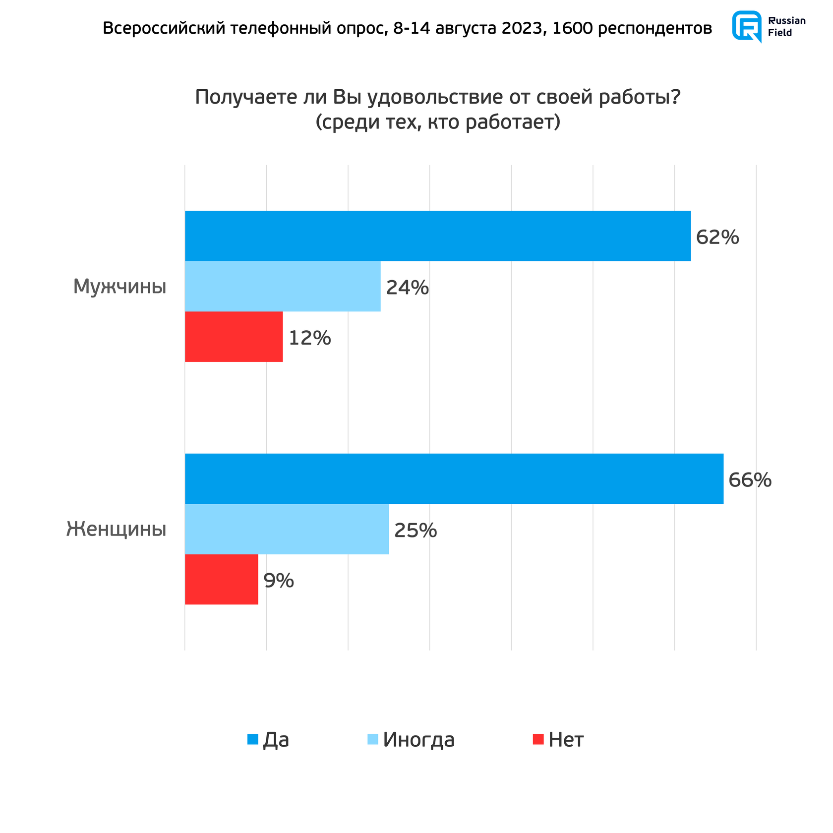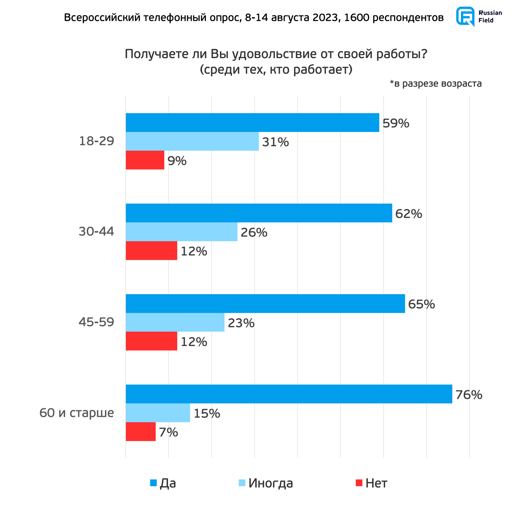 Почти две трети (64%) работающих опрошенных сообщили, что в той или иной степени получают удовольствие от своей работы. Еще почти четверть (24%) иногда довольны своей работой, а иногда нет. Лишь 11% занятых респондентов не получают удовольствия вовсе. Удовлетворение от своей занятости возрастает от молодых групп к старшим (с 59% до 76%).