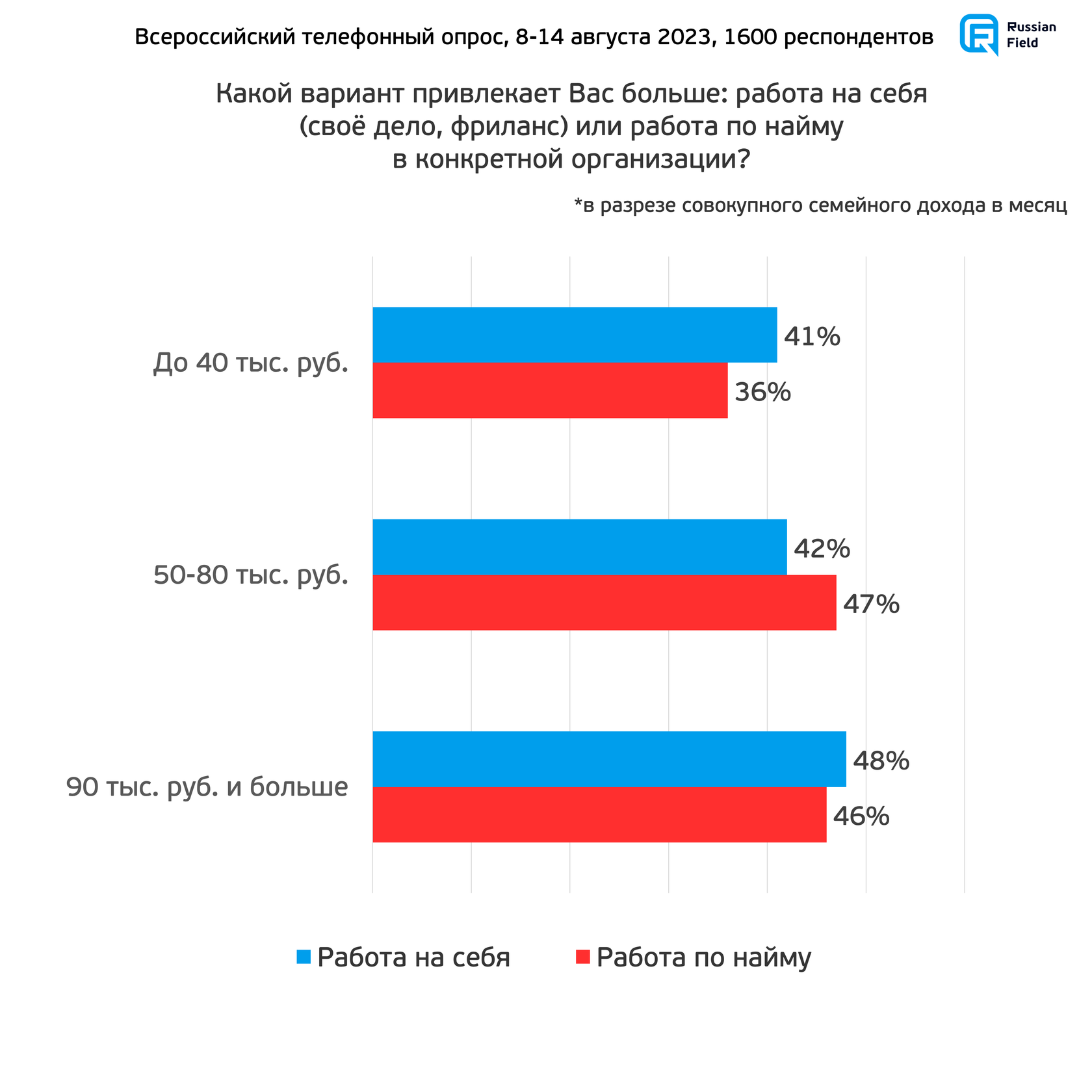 Желание работать по найму более характерно для опрошенных с высшим образованием (45%). Доля желающих работать на себя возрастает от менее обеспеченных респондентов к более обеспеченным, а среди зарабатывающих более 90 тыс. руб. она больше, чем доля желающих работать по найму: 48% и 46% соответственно).