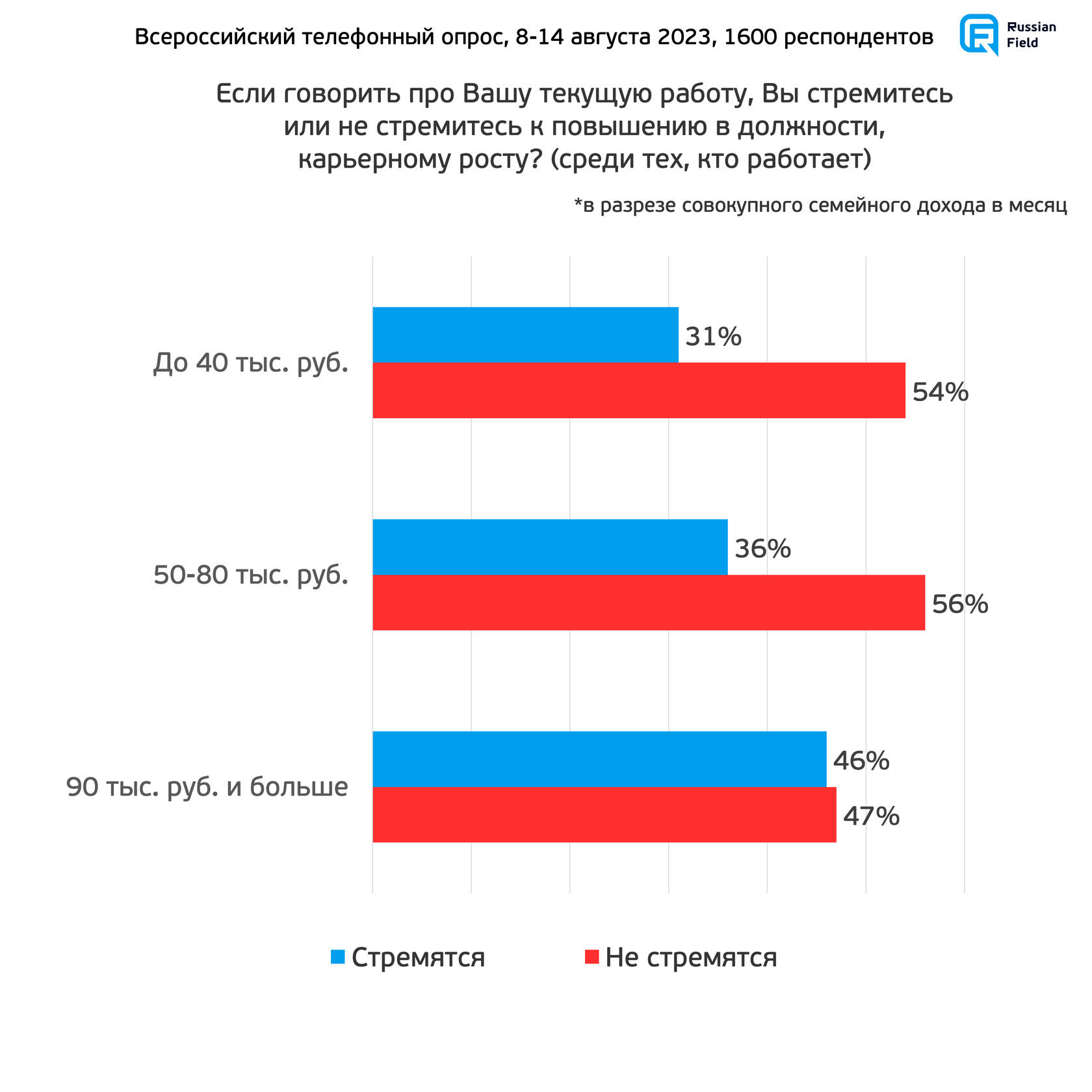 Стремление к повышению в должности более характерно для респондентов с доходом от 90 тыс. руб. в месяц и выше. В то же время корреляции с уровнем образования не обнаружено. Респонденты, которые не получают удовольствия от своей работы, чаще сообщают, что не стремятся к карьерному росту.