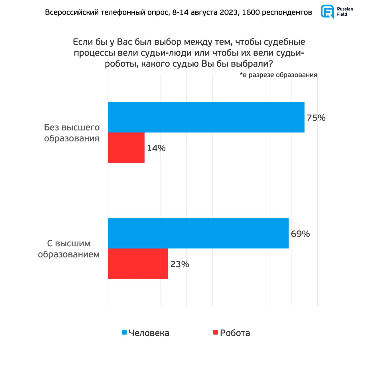 Респонденты с высшим образованием чаще предпочитают передачу правосудия в руки роботов (23% против 14% без высшего образования). В то же время с уровнем дохода отношение к данному вопросу не коррелирует.