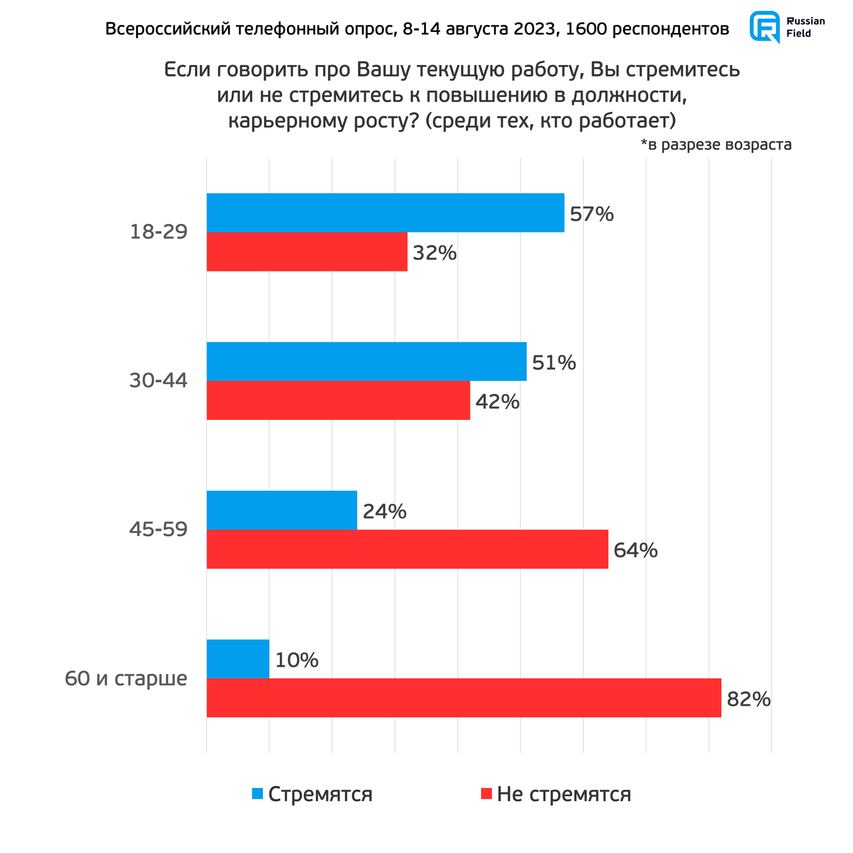 Более половины (52%) опрошенных заявили, что не стремятся к карьерному росту. Хотели бы повышения в должности 39% респондентов. Значимо чаще карьерные амбиции проявляют люди до 45 лет.